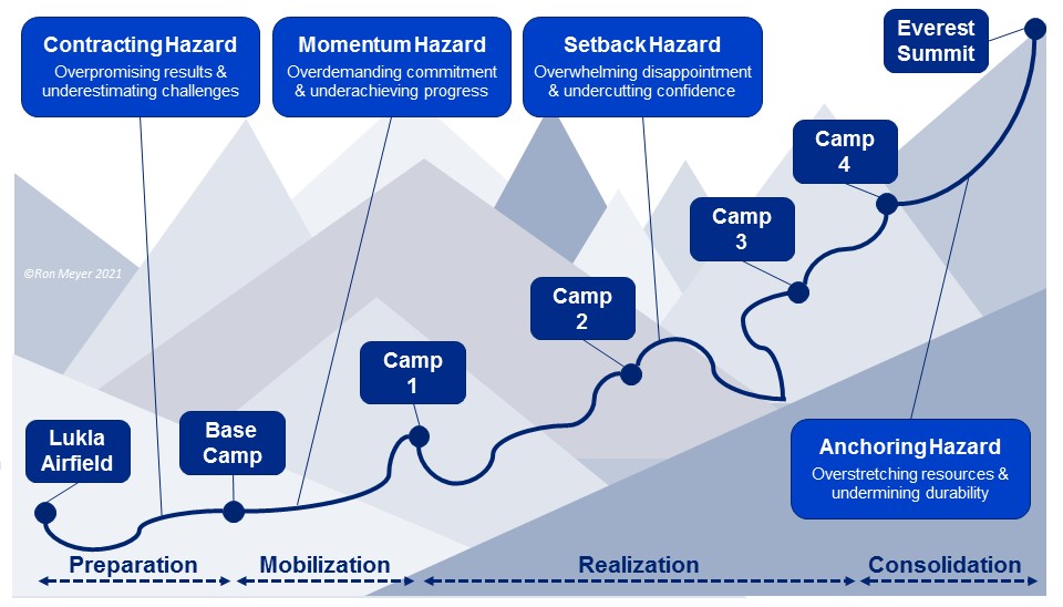 The Everest Model of Change uses the metaphor of climbing Mount Everest to explain the four main hazards people need to deal with when engaging in large-scale organizational change. Climbing Everest is a major endeavor, with the same four phases as in any change project: first comes preparation, during which a plan is made, resources are assembled and people are readied to get started; second comes mobilization, during which the group launches on its path; third comes realization, during which the largest part of the journey is completed; and fourth comes consolidation, during which the change is embedded and secured, so the organization doesn’t slide back into old behavior. In each phase there are multiple hazards, but one sticks out as the most treacherous to deal with.