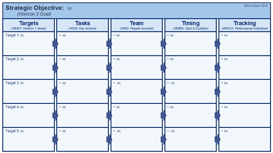 The 5T SMART Plan template offers a one-page framework for detailing each strategic objective in an organization’s big picture strategy. It asks the user to identify at most five strategic targets that need to be realized for each strategic objective, followed by the required key actions, people involved and timing of each action and some measure by which progress towards the target can be tracked. As such, the 5T SMART Plan is more detailed and tangible than the widely used OGSM (Objectives-Goals-Strategies-Measures) framework, while it also avoids the confusion of using the word “strategies” incorrectly.