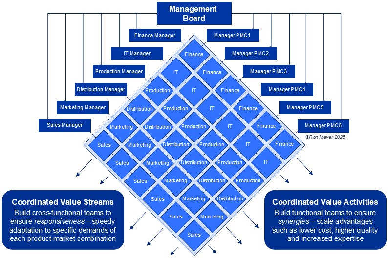 The Organizational Diamond framework offers a simple key for designing even complex organizations. It is based on the premise that when structuring an organization designers need to balance, on the one hand, the advantages of keeping similar value activities together in functional teams (diagonally on the left), with on the other hand the advantages of keeping complementary value activities together in cross-functional value stream teams (diagonally on the right). In other words, every organizational design is fundamentally a balancing act between achieving internal synergies and external responsiveness. When deciding on the most effective structure, this trade-off needs to be considered at various levels of aggregation.